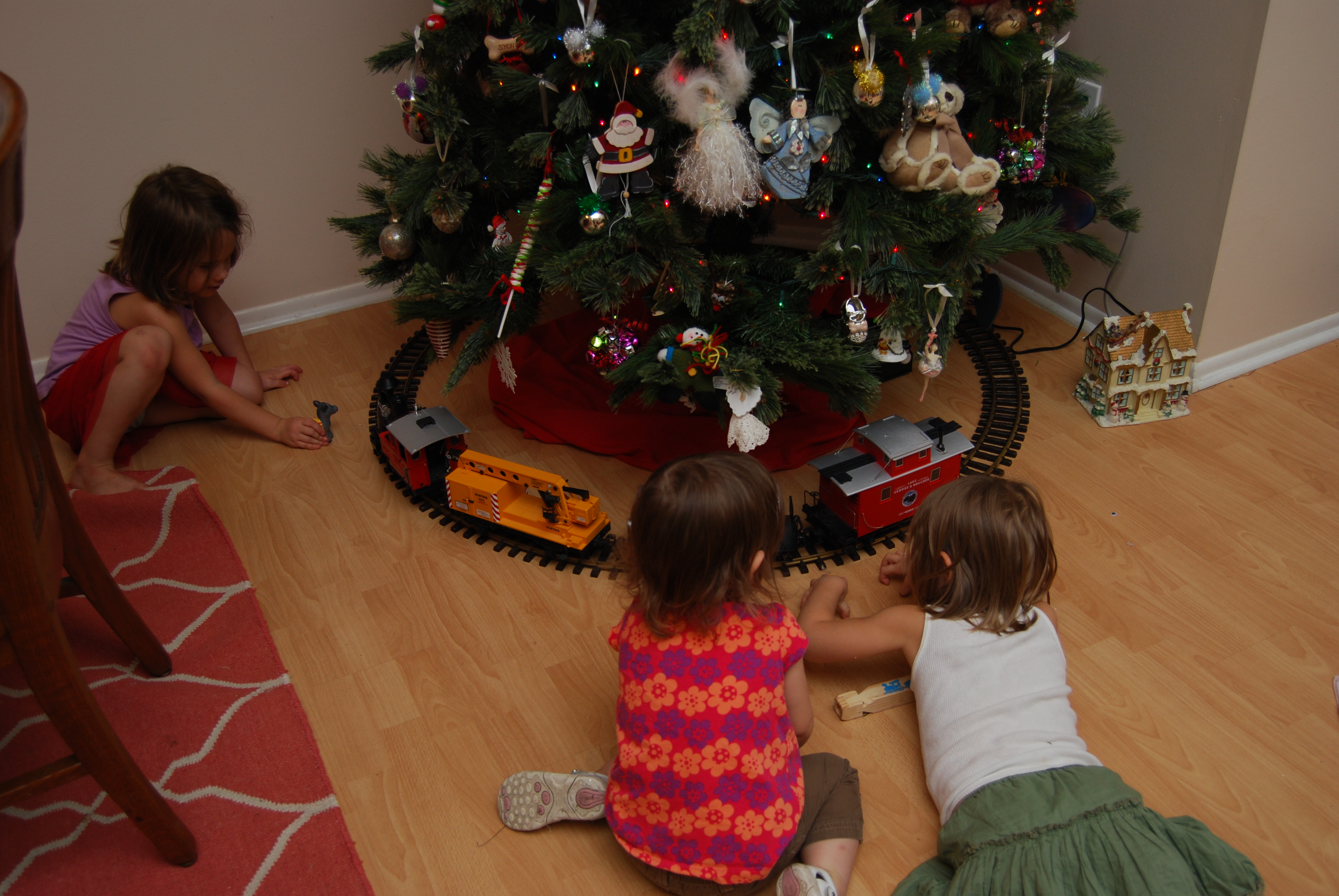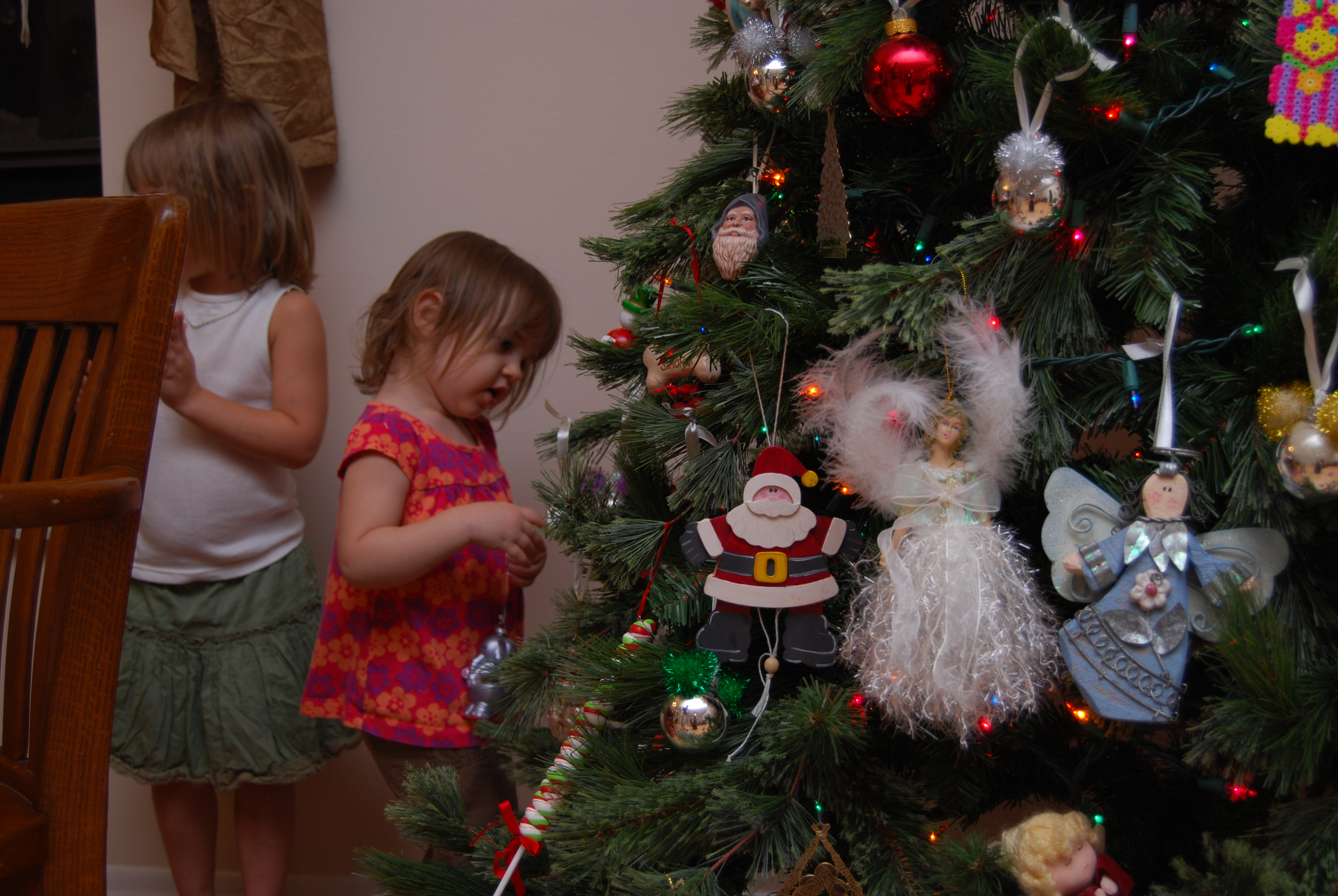 Is your home aglow? Ours is! Yesterday we spent the day decorating and making our home festive for the Christmas season. We hung a mistletoe ball, which Chloe calls “kissletoe.” Very appropriate I’d say. Our house has been graced by the presence our Christmas tree, which this year has rainbow lights–chosen by Willow. Memories in the form of ornaments were hung on each branch and the girls talked about each ornament as they found the perfect place for it–just like their mama. The train encircles the bottom and has captivated the minds of three precious little ladies, who gazed in pure joy at it while it continually chugged around the tree last night (until of course, curiosity got the better of them and it was derailed). We baked cookies and ate candy canes until it was time to say goodnight, even though some weren’t quite ready to abandon the festivities. I do love this season. There is an added excitement in their air as Christmas approaches and we are busily preparing our gifts for one another. As the girls play, I’ve heard their toys talk to each other about the most special part of Christmas, Jesus’ birthday. How precious that they can see the humble purpose through all the glamour and sparkle.