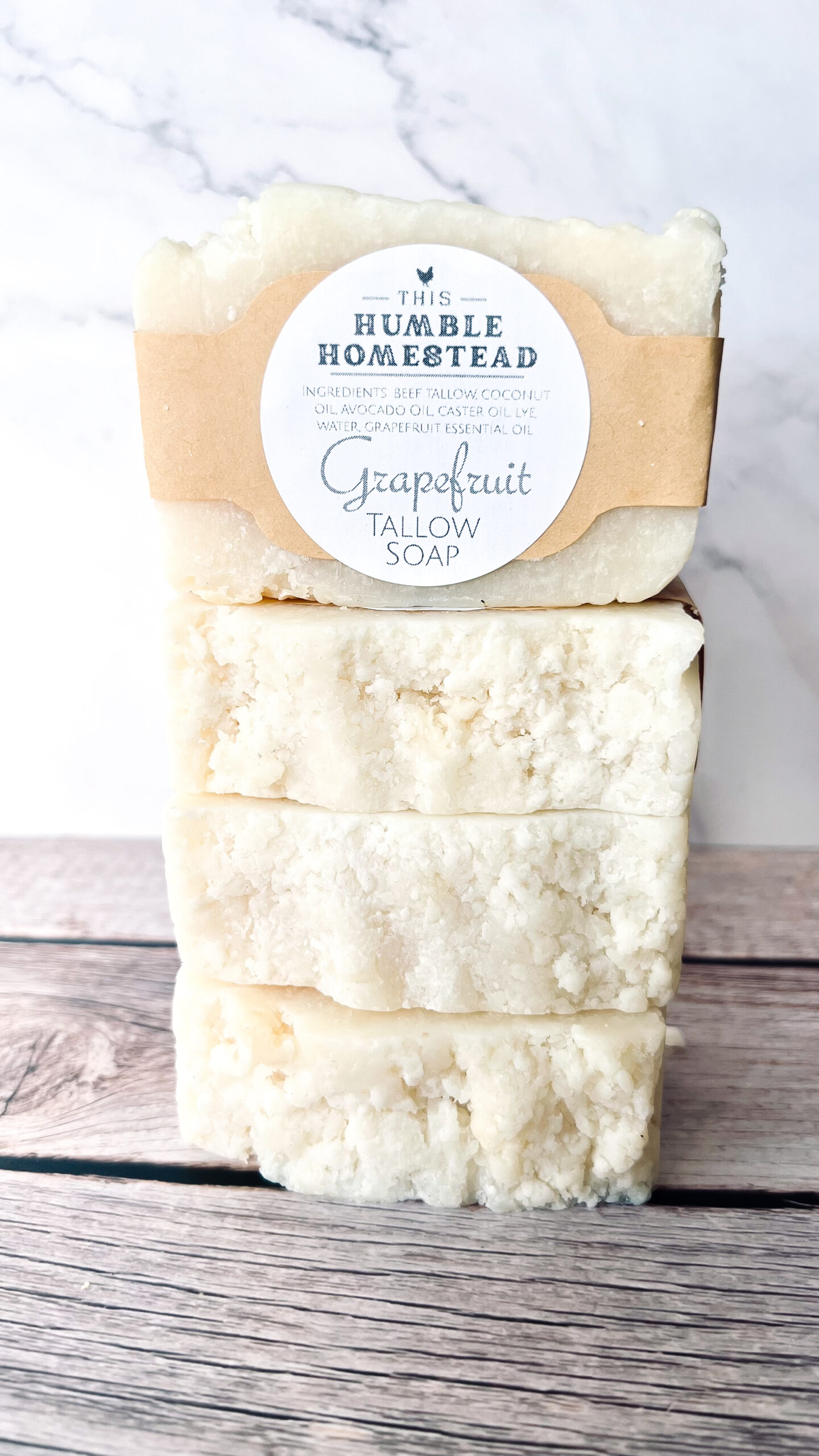 Grapefruit Tallow Soap -Ingredients: tallow, distilled water, lye, avocado oil, caster oil, coconut oil, grapefruit essential oil -4.5-5 oz. bar -Ships to US only -Free shipping for orders $59 and over!